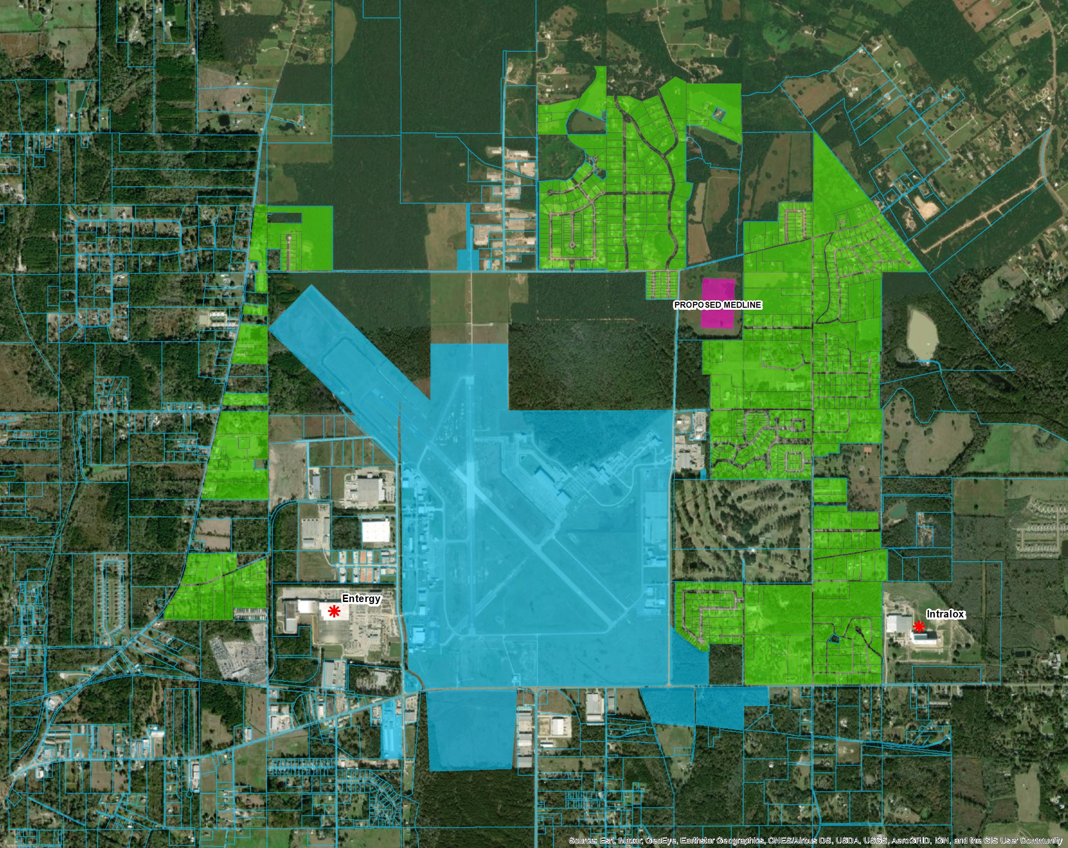 Please review the image file attached to this e-mail and allow me to explain its significance. The image named "LANDUSE" is a view of the Hammond Airport and surrounding areas, both inside and outside the city limits. The blue lines are tax parcel boundaries I downloaded from the Tangipahoa Parish GIS system and overlaid onto the map in my own GIS software. I analyzed the parcels surrounding the borders of the airport and shaded the ones with residential development green so that they would stand out. The shapes filled with blue are properties owned by the City of Hammond. Everything else is either undeveloped, commercial, or industrial in use. I also added a rectangle (hot pink) onto the proposed site. This representation of the proposed warehouse is to scale and it represents an area of 600,000 square feet. Finally, I dropped some placeholders over some other notable points of interest due to their size; Intralox off of Hwy 190 East and Entergy's warehouse, bill processing, and supply yard on Pride Drive. I would have liked to review the City's zoning information, but the online GIS map on the City's website has been down and unusable for over a week now, at least.